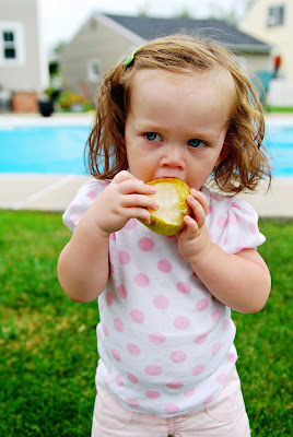 Avery with a big mouth full. She is definitely a pear fan!